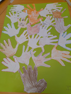 Na sessão de biblioteca cada criança desenhou o contorno da sua mão e depois coloriu a mão usando as caixas de lápis tons de pele.
